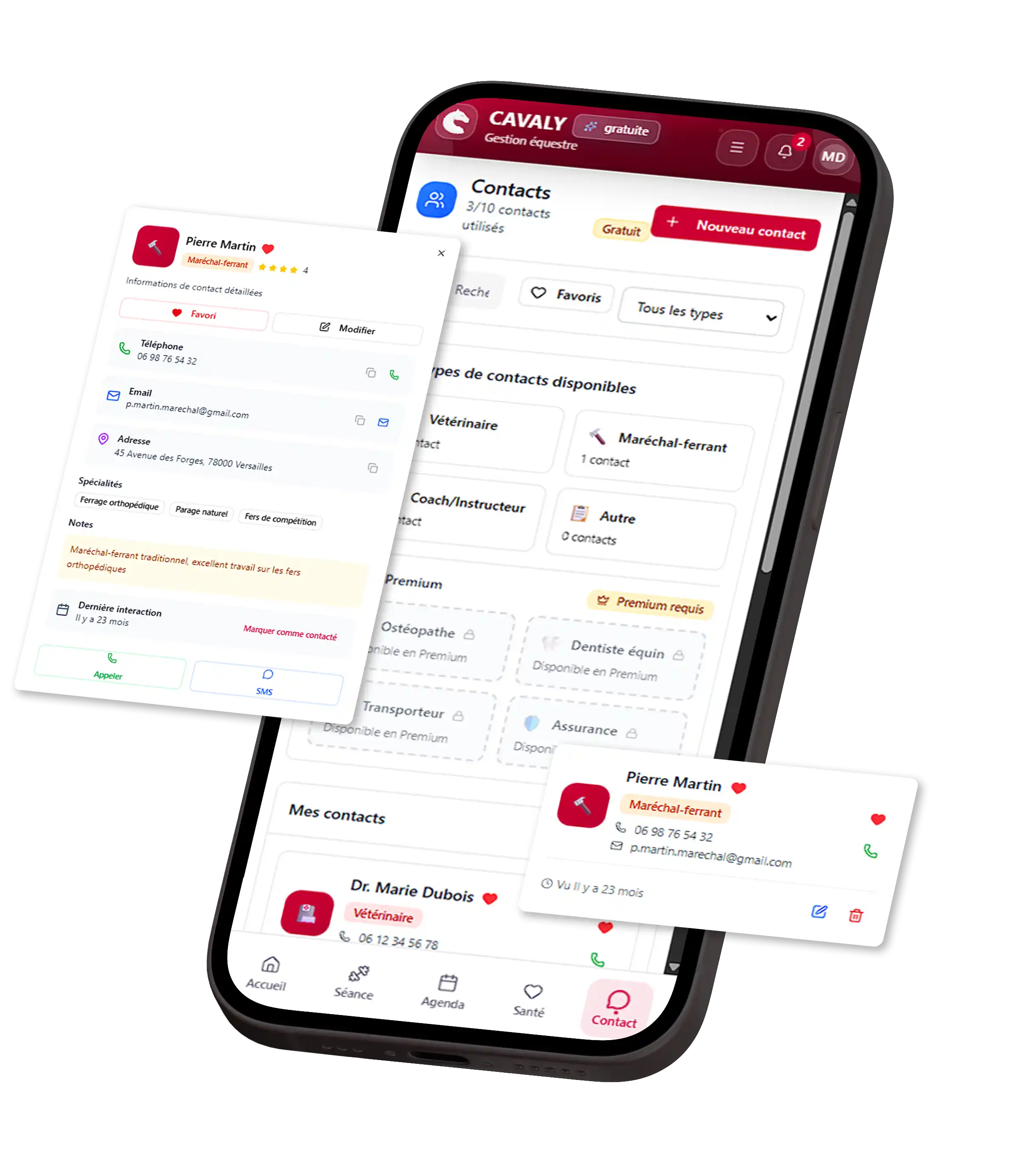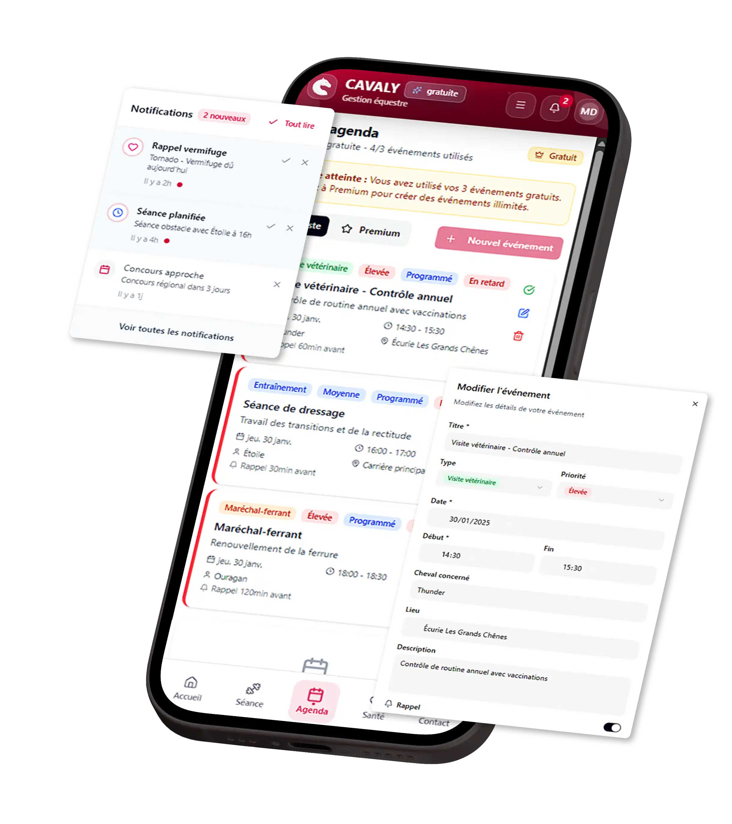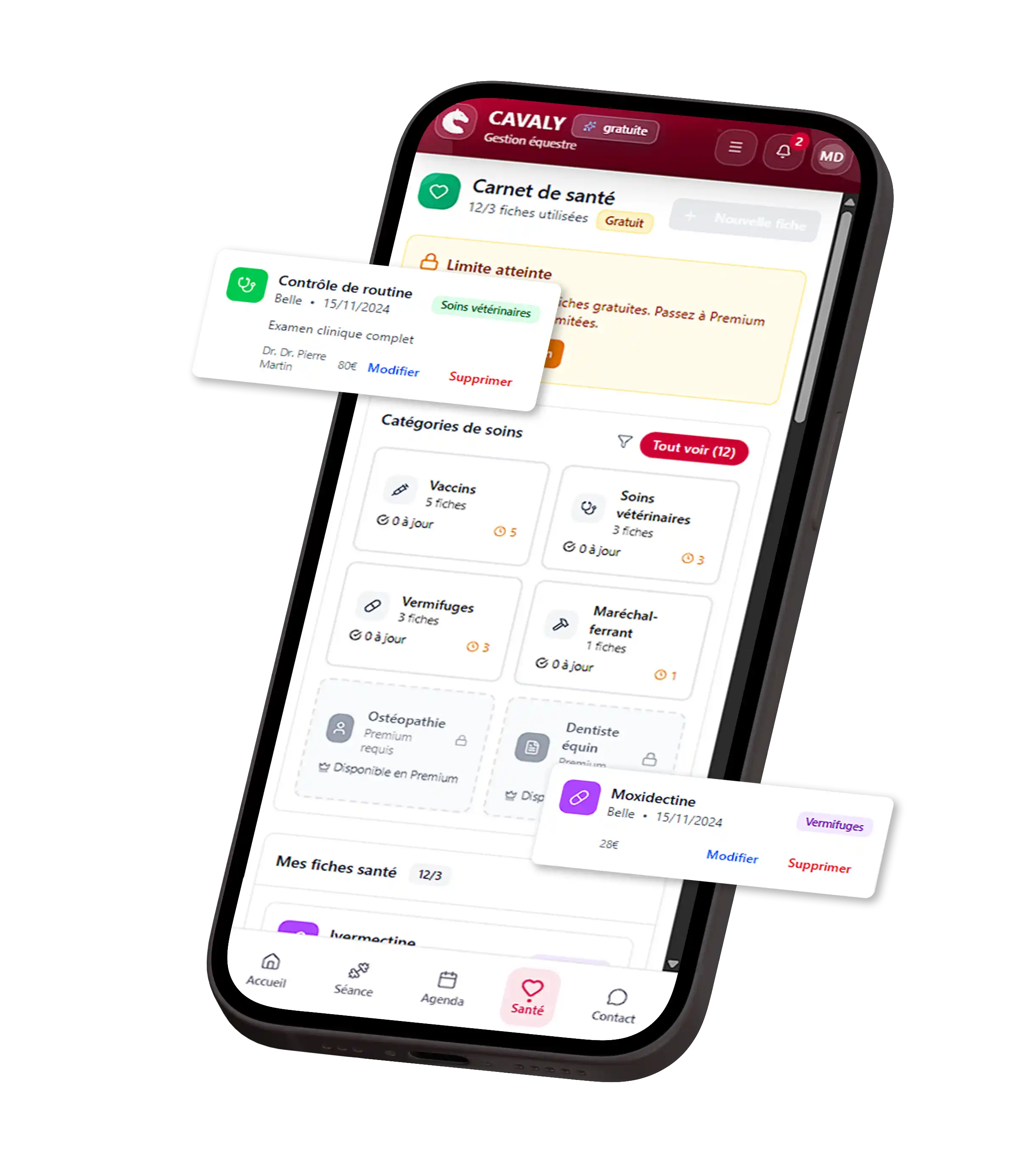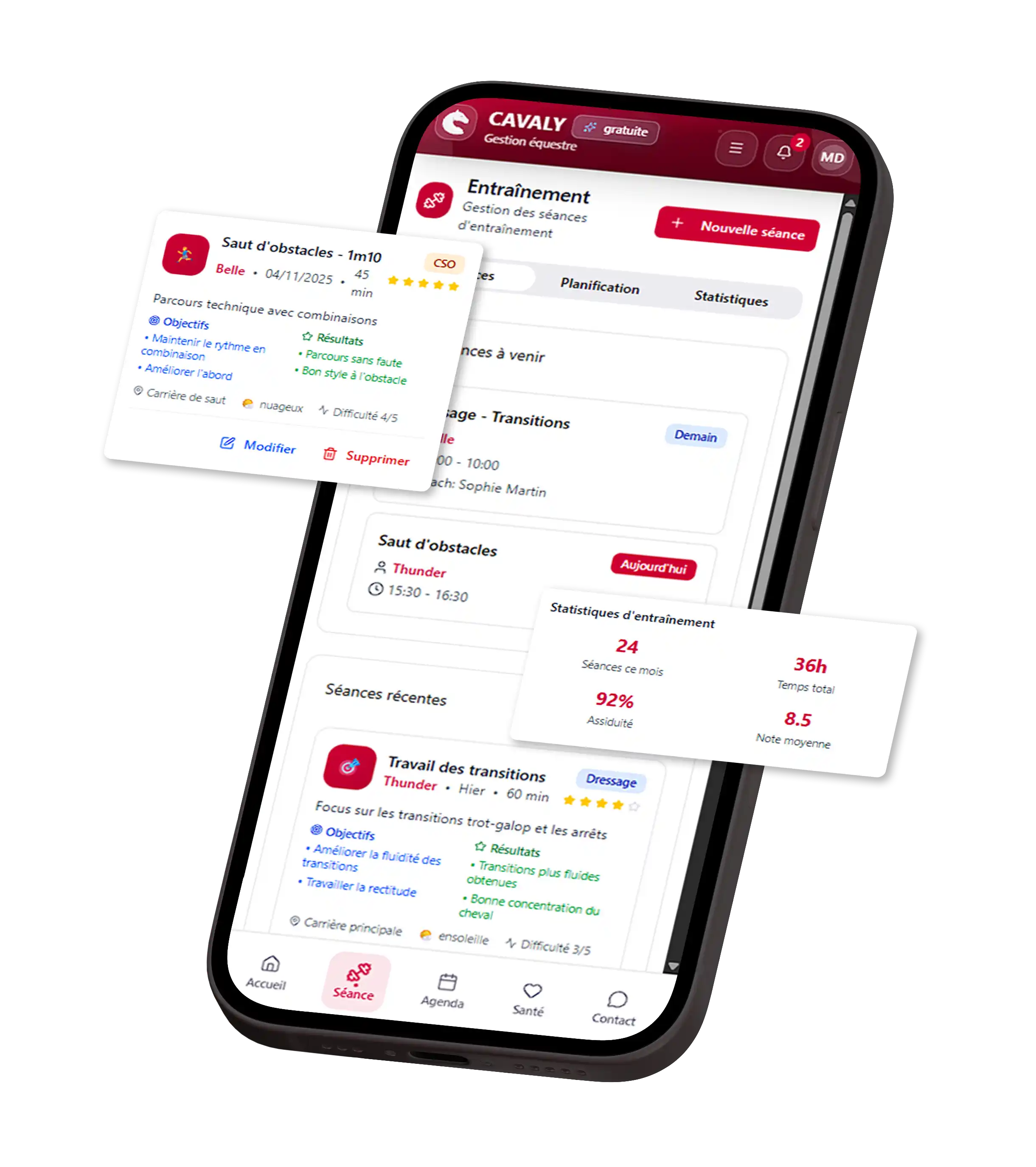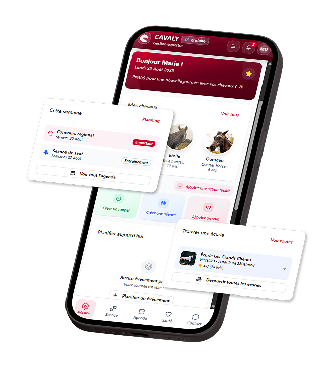 Cavaly est l'application tout-en-un qui transforme la façon dont vous gérez vos chevaux. Santé, entraînement, contacts, équipe : tout centralisé.